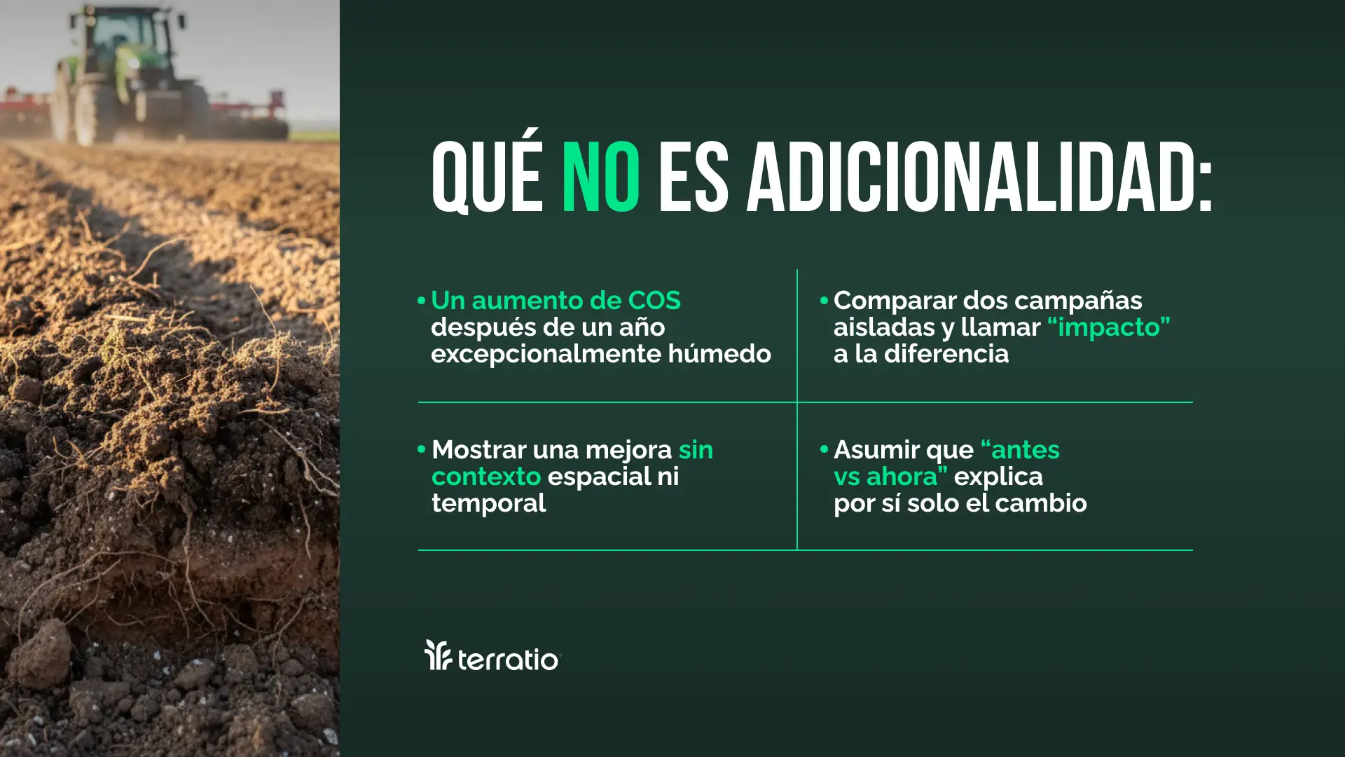 Adicionalidad no significa “el carbono subió”. Significa que subió como consecuencia del manejo, y no por factores externos que no controlamos. Clima, ciclos húmedos, cambios regionales en productividad, tendencias generales del sistema agrícola: todo eso puede hacer subir (o bajar) el COS sin que el manejo tenga mucho que ver.